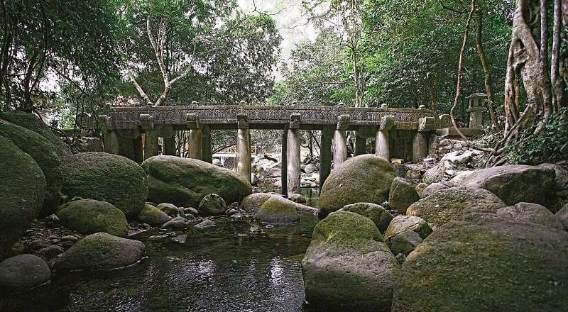 Suối Giải Oan và cây cầu gỗ trụ đá bắc qua suối